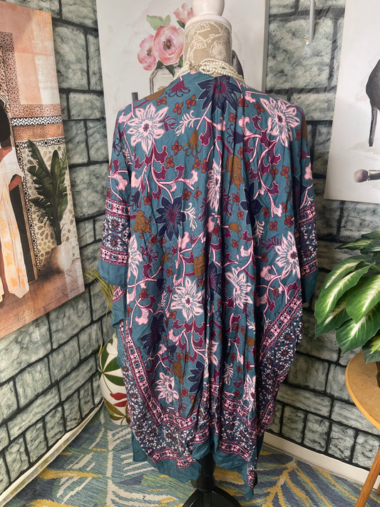 Time & Tru Green Purple Cover Duster Women sz Small / Medium